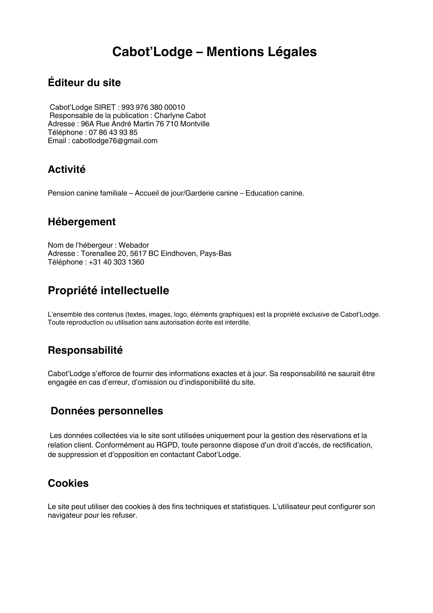 "Cabot ' Lodge est un véritable paradis pour les chiens ! Mon labrador adore y passer ses journées. Charlyne est formidable, elle a su identifier et m'expliquer des comportements importants que je ne comprenais pas et je ne néglige plus mon chien, grâce à son suivi. Je recommande vivement !"